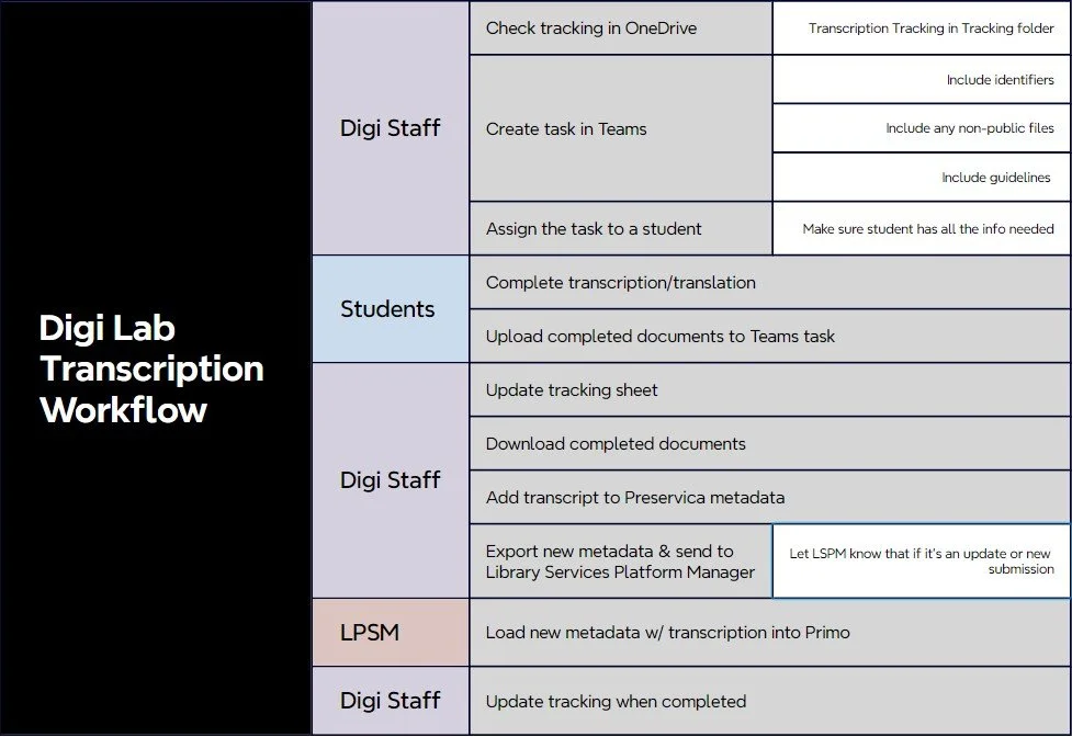 Digi staff will review the Word doc and send it back to the student if revisions are needed. Once the transcription is approved, Digi staff will update the transcription tracking sheet and add the transcription to the item's metadata in Excel or Preservica. If the item is already public in Preservica, the metadata will need to be re-harvested to Primo. Once everything is complete, Digi staff will update the tracking sheet.